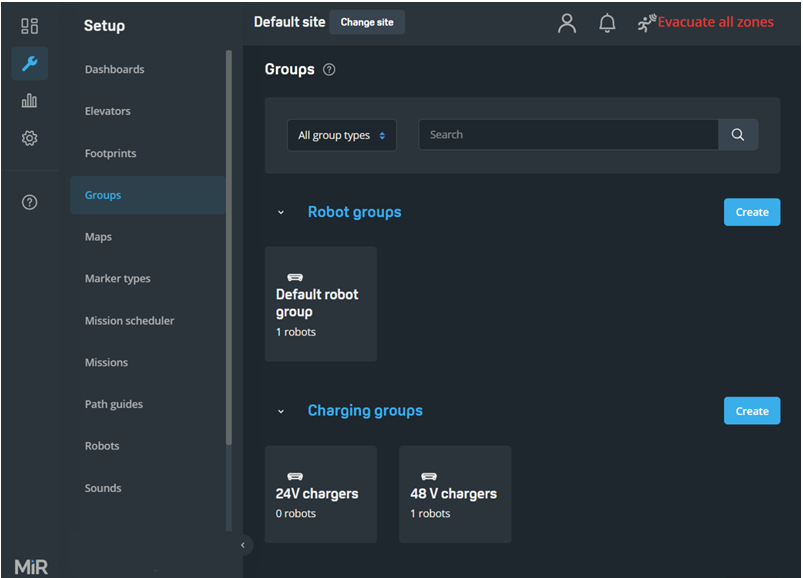 MiR Fleet now has a separate page for organizing Charging groups, Robot groups, and Staging groups. You are now able to clearly see which robots and components are part of which groups on the same page and you can quickly add and remove robots and components from the groups.