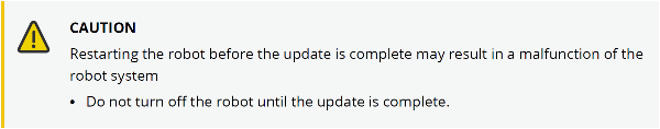 - Make sure the robot stays connected to the charger during the battery update process. Otherwise you risk the battery shutting down permanently to an unrecoverable state. The robot will not begin executing any missions it is assigned (by you or MiR Fleet) until it has finished updating the firmware.